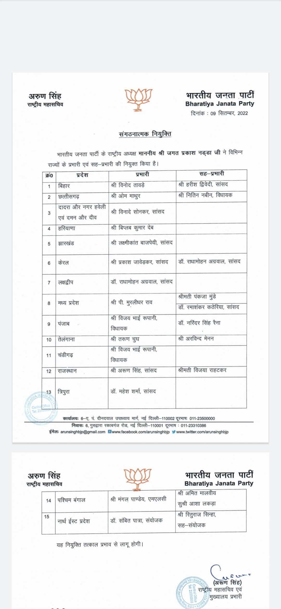 ਬੀਜੇਪੀ ਹਾਈਕਮਾੰਡ ਨੇ ਕੁੱਲ 15 ਸੂਬਿਆੰ ਵਿੱਚ ਨਵੇੰ ਇੰਚਾਰਜ ਲਾਏ ਹਨ। ਇਹਨਾੰ ਵਿੱਚ ਤਰੁਣ ਚੁੱਘ ਦਾ ਵੀ ਨਾੰਅ ਹੈ। ਚੁੱਘ ਨੂੰ ਤੇਲੰਗਾਨਾ ਦਾ ਇੰਚਾਰਜ ਲਾਇਆ ਗਿਆ ਹੈ। ਹਰਿਆਣਾ ਵਿੱਚ ਤ੍ਰਿਪੁਰਾ ਦੇ ਸਾਬਕਾ ਮੁੱਖ ਮੰਤਰੀ ਬਿਪਲਭ ਦੇਵ ਨੂੰ ਇੰਚਾਰਜ ਲਾਇਆ ਗਿਆ ਹੈ।