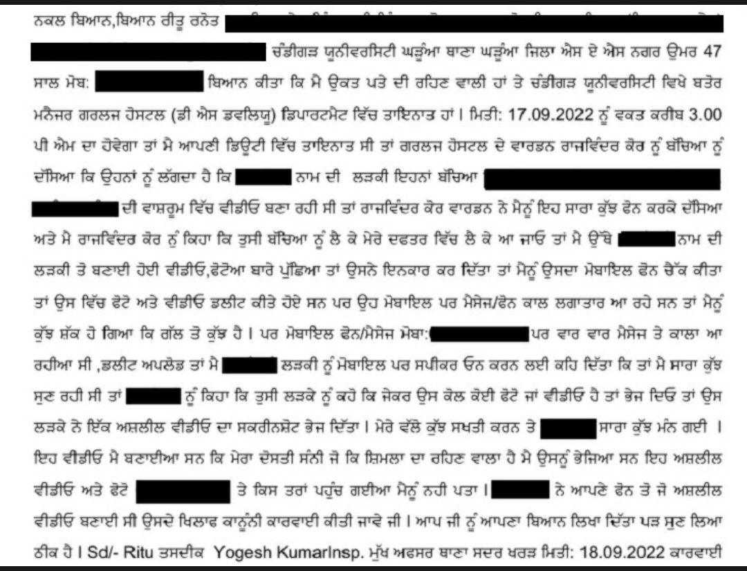 ਇਸ ਕੇਸ ਵਿੱਚ ਦਰਜ FIR ਦੇ ਮੁਤਾਬਕ, ਸ਼ਨੀਵਾਰ ਸ਼ਾਮ 3 ਵਜੇ ਦੇ ਕਰੀਬ ਕੁਝ ਕੁੜੀਆੰ ਹੋਸਟਲ ਵਾਰਡਨ ਰਾਜਵਿੰਦਰ ਕੌਰ ਦੇ ਕੋਲ ਪਹੁੰਚੀਆੰ। ਕੁੜੀਆੰ ਨੇ ਖਦਸ਼ਾ ਜ਼ਾਹਿਰ ਕੀਤਾ ਕਿ ਮੁਲਜ਼ਮ ਵਿਦਿਆਰਥਣ ਬਾਥਰੂਮ ਵਿੱਚ 6 ਕੁੜੀਆੰ ਦਾ ਵੀਡੀਓ ਬਣਾ ਰਹੀ ਸੀ। ਵਾਰਡਨ ਰਾਜਵਿੰਦਰ ਕੌਰ ਨੇ ਕੁੜੀ ਤੋੰ ਪੁੱਛਗਿੱਛ ਕੀਤੀ, ਜਿਸ ਤੋੰ ਬਾਅਦ ਪੂਰਾ ਮਾਮਲਾ ਗਰਲਸ ਹੋਸਟਲ ਦੀ ਮੈਨੇਜਰ ਰੀਤੂ ਦੇ ਧਿਆਨ ਵਿੱਚ ਲਿਆੰਦਾ ਗਿਆ।