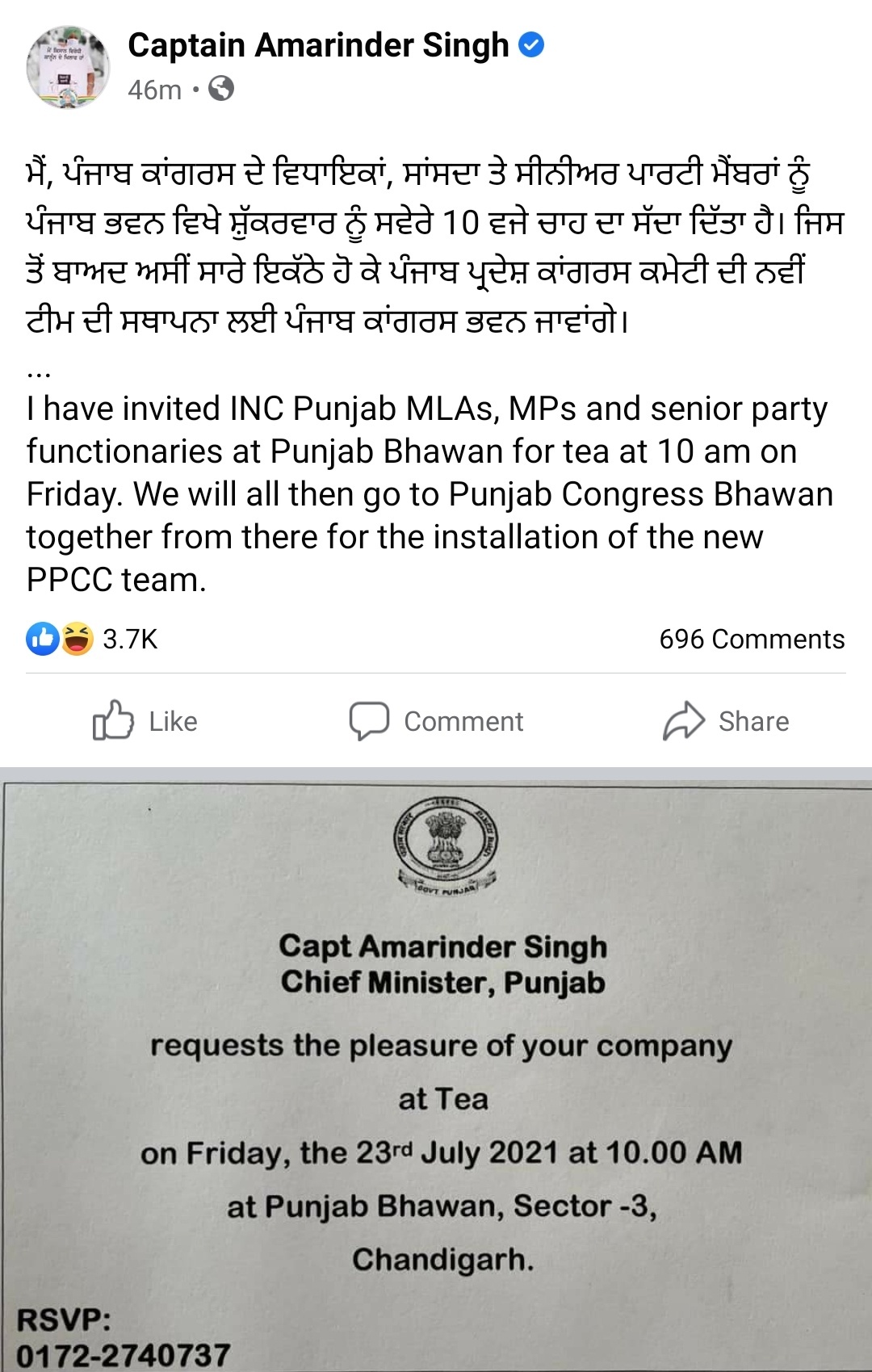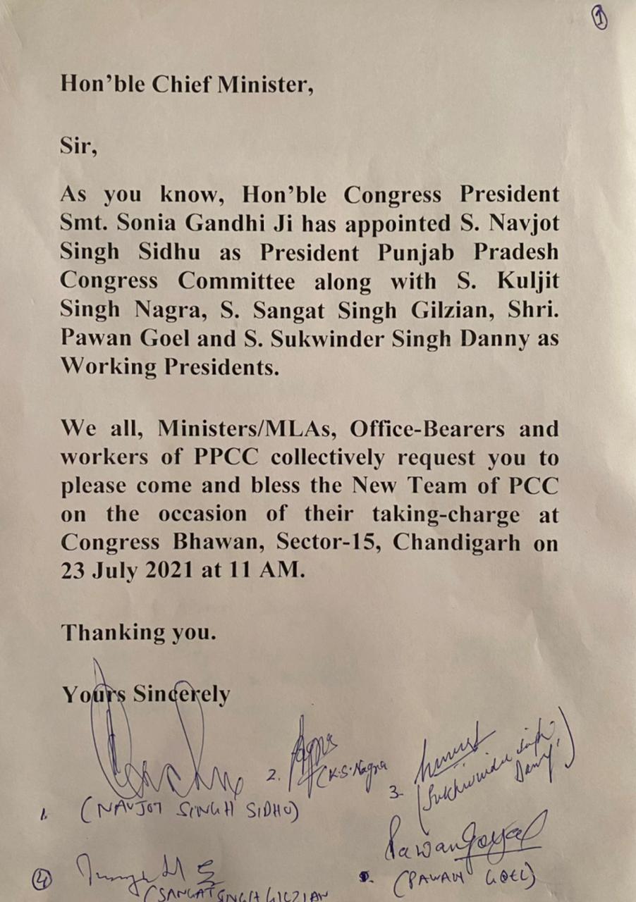 ਜ਼ਿਕਰੇਖਾਸ ਹੈ ਕਿ ਤਾਜਪੋਸ਼ੀ ਸਮਾਗਮ ਤੋਂ ਪਹਿਲਾਂ ਸੀਐੱਮ ਕੈਪਟਨ ਅਮਰਿੰਦਰ ਸਿੰਘ ਵੱਲੋਂ ਪਾਰਟੀ ਦੇ ਸਾਰੇ ਵਿਧਾਇਕਾਂ, ਸਾਂਸਦਾਂ ਅਤੇ ਸੀਨੀਅਰ ਪਾਰਟੀ ਮੈਂਬਰਾਂ ਨੂੰ ਸਵੇਰੇ 10 ਵਜੇ ਪੰਜਾਬ ਭਵਨ ਵਿਖੇ ਚਾਹ ਲਈ ਸੱਦਿਆ ਗਿਆ ਹੈ। ਇਸ ਉਪਰੰਤ ਸਾਰੇ ਇਕੱਠੇ ਹੀ ਸਿੱਧੂ ਅਤੇ ਉਹਨਾਂ ਦੀ ਨਵੀਂ ਟੀਮ ਦੀ ਤਾਜਪੋਸ਼ੀ ਕਾਂਗਰਸ ਭਵਨ ਜਾਣਗੇ। ਸੀਐੱਮ ਨੇ ਖੁਦ ਸੋਸ਼ਲ ਮੀਡੀਆ ‘ਤੇ ਇਸ ਬਾਰੇ ਜਾਣਕਾਰੀ ਦਿੱਤੀ ਹੈ।
