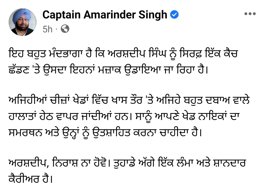 ਸਾਬਕਾ CM ਕੈਪਟਨ ਅਮਰਿੰਦਰ ਸਿੰਘ ਨੇ ਟਵਿਟਰ ‘ਤੇ ਲਿਖਿਆ, “ਇਹ ਬਹੁਤ ਮੰਦਭਾਗਾ ਹੈ ਕਿ ਅਰਸ਼ਦੀਪ ਸਿੰਘ ਨੂੰ ਸਿਰਫ਼ ਇੱਕ ਕੈਚ ਛੱਡਣ ‘ਤੇ ਉਸਦਾ ਇਹਨਾਂ ਮਜ਼ਾਕ ਉਡਾਇਆ ਜਾ ਰਿਹਾ ਹੈ। ਅਜਿਹੀਆਂ ਚੀਜ਼ਾਂ ਖੇਡਾਂ ਵਿੱਚ ਖਾਸ ਤੌਰ ‘ਤੇ ਅਜਿਹੇ ਬਹੁਤ ਦਬਾਅ ਵਾਲੇ ਹਾਲਾਤਾਂ ਹੇਠ ਵਾਪਰ ਜਾਂਦੀਆਂ ਹਨ। ਸਾਨੂੰ ਆਪਣੇ ਖੇਡ ਨਾਇਕਾਂ ਦਾ ਸਮਰਥਨ ਅਤੇ ਉਨ੍ਹਾਂ ਨੂੰ ਉਤਸ਼ਾਹਿਤ ਕਰਨਾ ਚਾਹੀਦਾ ਹੈ। ਅਰਸ਼ਦੀਪ, ਨਿਰਾਸ਼ ਨਾ ਹੋਵੋ। ਤੁਹਾਡੇ ਅੱਗੇ ਇੱਕ ਲੰਮਾ ਅਤੇ ਸ਼ਾਨਦਾਰ ਕੈਰੀਅਰ ਹੈ।”