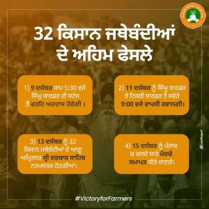• 11 ਦਸੰਬਰ ਨੂੰ ਦਿੱਲੀ ਤੋਂ ਪੰਜਾਬ ਲਈ ਫਤਹਿ ਮਾਰਚ ਸ਼ੁਰੂ ਹੋਵੇਗਾ। ਸਿੰਘੂ ਅਤੇ ਟਿਕਰੀ ਬਾਰਡਰ ਦੇ ਕਿਸਾਨ ਇਕੱਠੇ ਪੰਜਾਬ ਲਈ ਰਵਾਨਾ ਹੋਣਗੇ।
