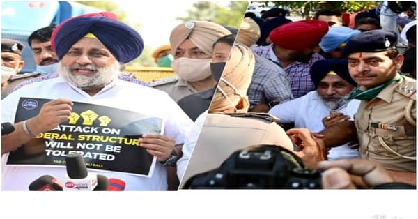 Police manhandle, hustle party president S. Sukhbir S. Badal, supporters agitating & protesting de facto President’s rule and attack on federal structure through handing half of Punjab to @BSF_India. Taken to Sec 3 Police station from protest & dharna site in front of Raj Bhawan. pic.twitter.com/0jMXC8W85U