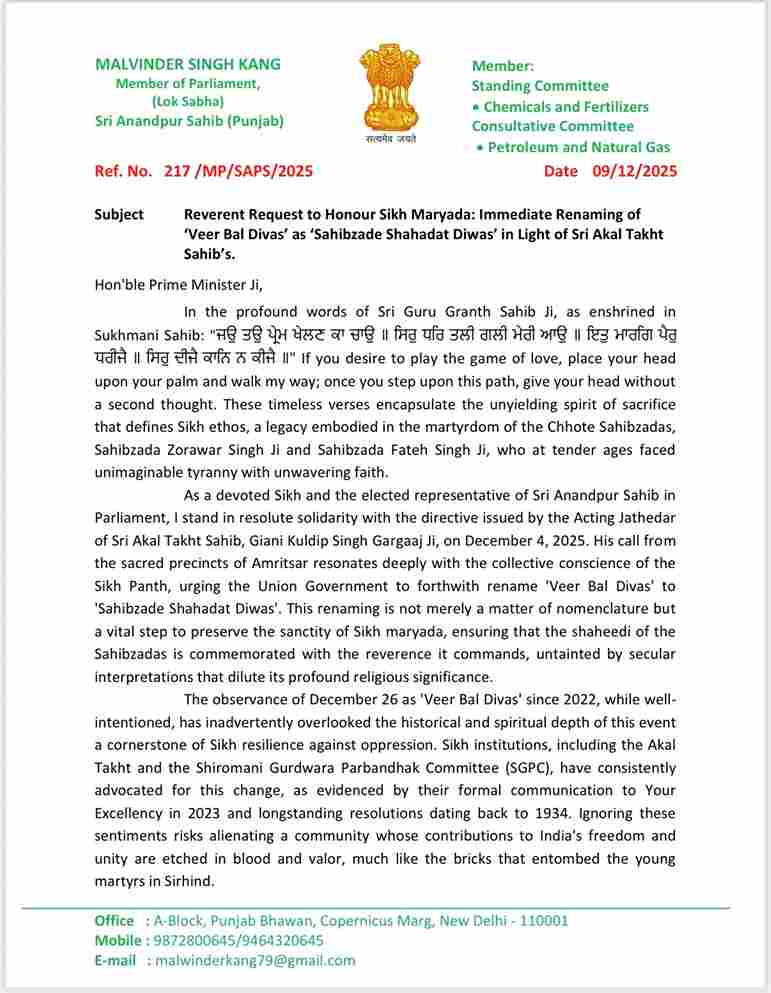 ਆਮ ਆਦਮੀ ਪਾਰਟੀ ਦੇ ਸ੍ਰੀ ਅਨੰਦਪੁਰ ਸਾਹਿਬ ਤੋਂ ਲੋਕ ਸਭਾ ਮੈਂਬਰ ਮਲਵਿੰਦਰ ਸਿੰਘ ਕੰਗ ਨੇ ਪ੍ਰਧਾਨ ਮੰਤਰੀ ਨਰੇਂਦਰ ਮੋਦੀ ਨੂੰ ਇੱਕ ਪੱਤਰ ਲਿਖਿਆ ਹੈ। ਇਸ ਪੱਤਰ ਵਿੱਚ ਉਨ੍ਹਾਂ ਨੇ ਸ੍ਰੀ ਗੁਰੂ ਗੋਬਿੰਦ ਸਿੰਘ ਜੀ ਦੇ ਛੋਟੇ ਸਾਹਿਬਜ਼ਾਦਿਆਂ ਦੀ ਸ਼ਹਾਦਤ ਨੂੰ ਸਮਰਪਿਤ ਮਨਾਏ ਜਾਂਦੇ ‘ਵੀਰ ਬਾਲ ਦਿਵਸ’ ਦਾ ਨਾਂ ਬਦਲ ਕੇ ‘ਸਾਹਿਬਜ਼ਾਦੇ ਸ਼ਹਾਦਤ ਦਿਵਸ’ ਰੱਖਣ ਦੀ ਅਪੀਲ ਕੀਤੀ ਹੈ।